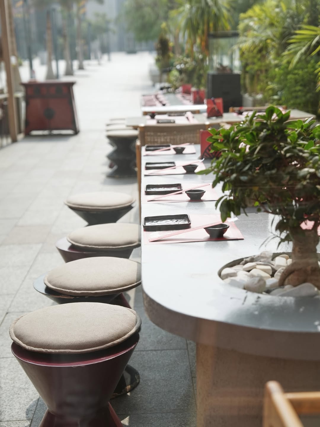 The interior reflects Japanese culture with a modern touch. The space feels intimate, clean, and considered, created for guests who appreciate detail and atmosphere. Red is used throughout the design and branding, setting the tone with warmth, confidence, and character — starting from the entrance itself.